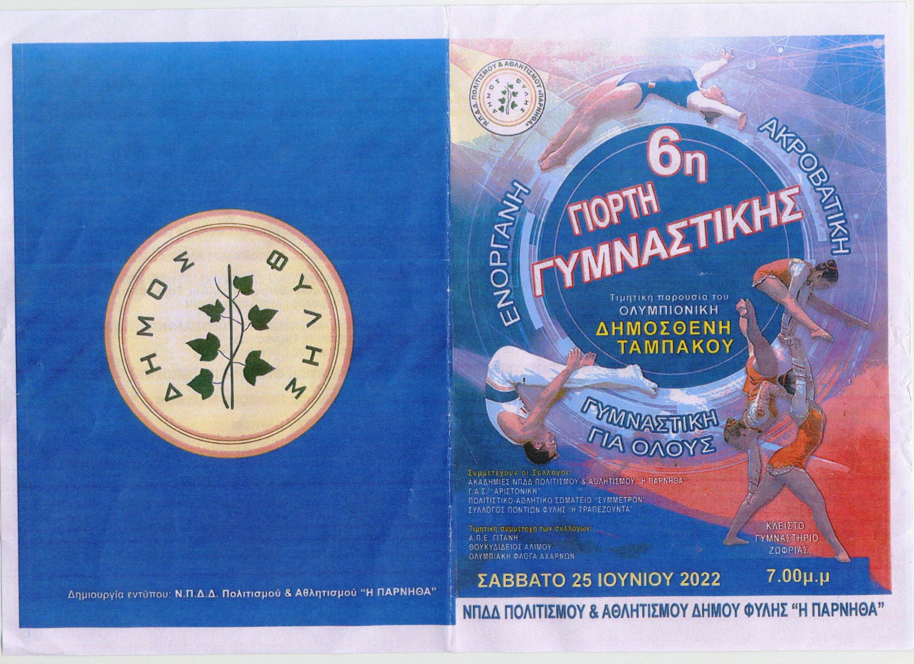 Ανακοίνωσε, ακόμα ότι ο χρυσός Ολυμπιονίκης Δημοσθένης Ταμπάκος ο οποίος δεν κατάφερε να παρευρεθεί λόγω ασθένειας, σύντομα θα βρεθεί κοντά στα τμήματα της Πάρνηθας προκειμένου να μεταφέρει στους αθλητές τους την εμπειρία και τις πολύτιμες γνώσεις του. Ο Γιώργος Μαυροειδής καλωσόρισε επίσης τους εκπροσώπους της Ελληνικής Ομοσπονδίας Γυμναστικής κι ευχαρίστησε τον Δήμαρχο Φυλής Χρήστο Παππού για την ολόπλευρη στήριξή του.