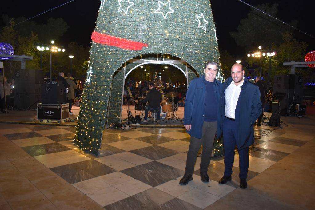 Στην κατάμεστη Πλατεία Ηρώων η λαμπερή βραδιά άνοιξε θεαματικά με την είσοδο της Φιλαρμονικής που, υπό τη διεύθυνση του μαέστρου της Νίκου Καλομοίρη, έπαιξε γνωστές Χριστουγεννιάτικες και Πρωτοχρονιάτικες μελωδίες.